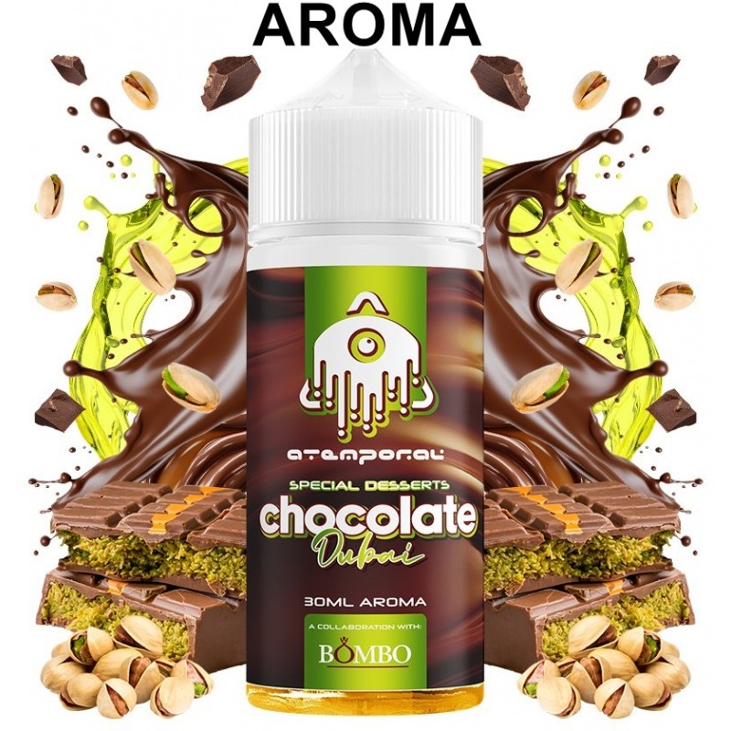 Atemporal Chocolate Dubai Aroma Longfill 30ml. Una combinación lujosa y adictiva que mezcla el chocolate con leche más cremoso con una delicada crema de pistacho y el toque crujiente y exótico de la pasta kataifi. Esta mezcla se inspira en el famoso postre árabe que da nombre al aroma, ofreciendo una experiencia de vapeo intensa, dulce y sofisticada.