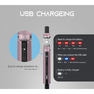 El kit Q16 Pro de Justfog es una versión mejorada del Q16 anterior. Dispone de una batería de larga duración con 900 mAh, y una capacidad de 1.9 ml de líquido. Adopta el sistema Star-shield para prevenir el goteo en la boca, y cuenta con 4 niveles de voltaje ajustables y sistema de flujo de aire mejorado.
