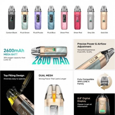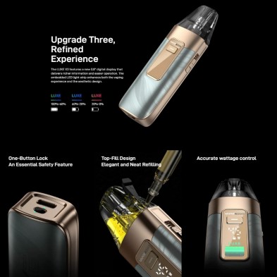 El kit Luxe X3 representa una evolución respecto a modelos anteriores, incorporando la tecnología Dual Mesh para ofrecer un sabor más intenso y consistente, alargando la vida útil de las resistencias y mejorando la experiencia de vapeo. Su potencia de salida de 5 a 45W permite un control preciso de la calada, adaptándose tanto a usuarios MTL como RDL.